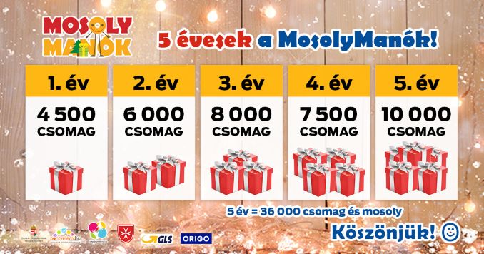 Az elmúlt 8 évben, 80 000 mosolyt gyűjtöttünk a rászoruló gyermekeknek a MosolyManók segítségével, ugyanis ennyi karácsonyi ajándékcsomagot készítettek a tanulók rászoruló társaiknak a PontVelem Okos Program, a Magyar Máltai Szeretetszolgálat és a GLS Hungary közös felhívására, melyet a Belügyminisztérium Köznevelésért Felelős Államtitkársága is támogat.
