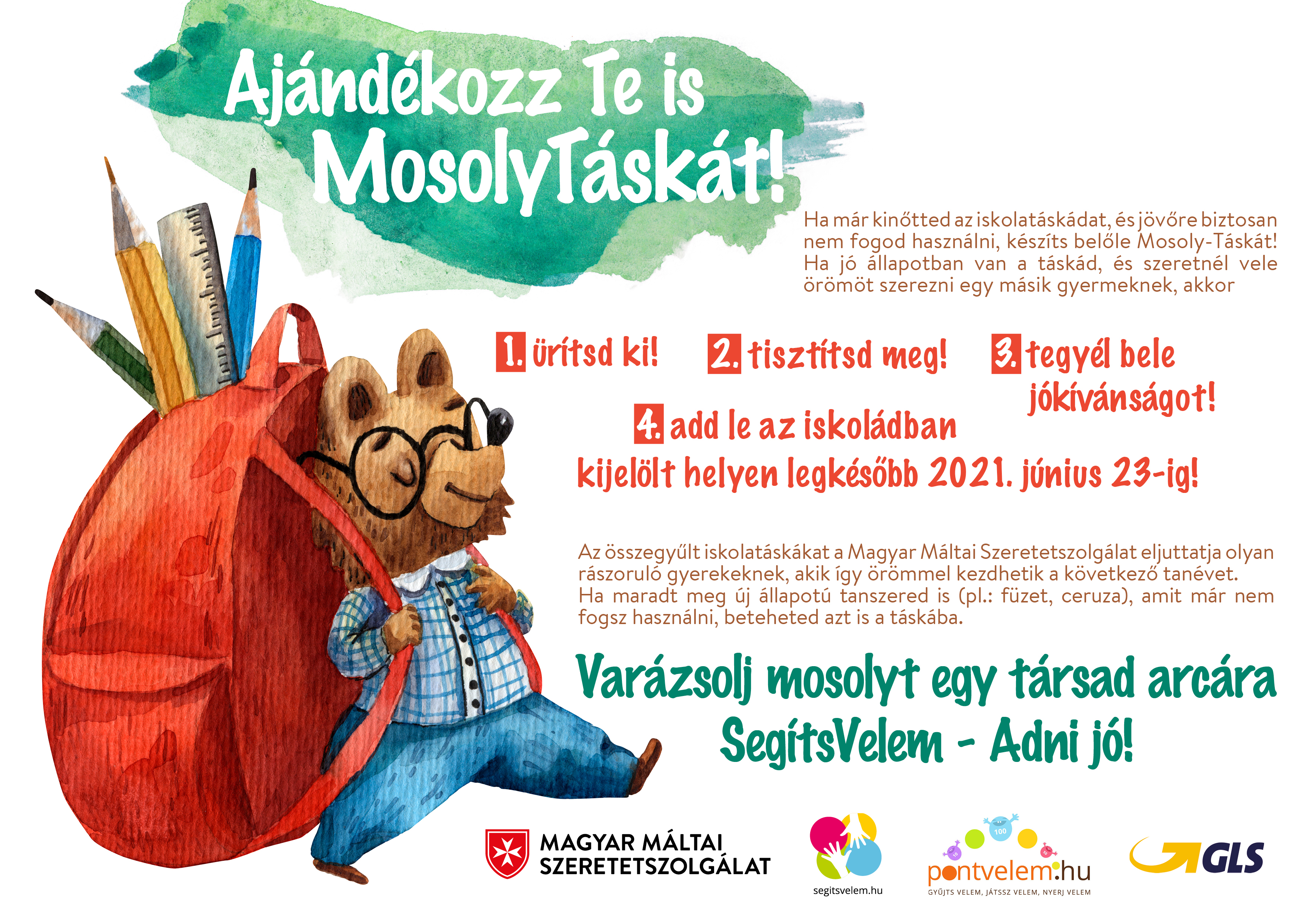 PontVelem Okos Program SegítsVelem MosolyTáska akciója során, az iskolák 2022-ben második alkalommal gyűjthették a használt, de jó állapotú iskolatáskákat, hogy azokat a Máltai Szeretetszolgálat eljuttassa a következő tanév előtt a rászoruló gyermekek részére. Az adománygyűjtés a Magyar Máltai Szeretetszolgálattal közös szervezésében a GLS Hungary csomaglogisztikai szolgáltató támogatásával valósult meg. Köszönjük a felajánlásokat!